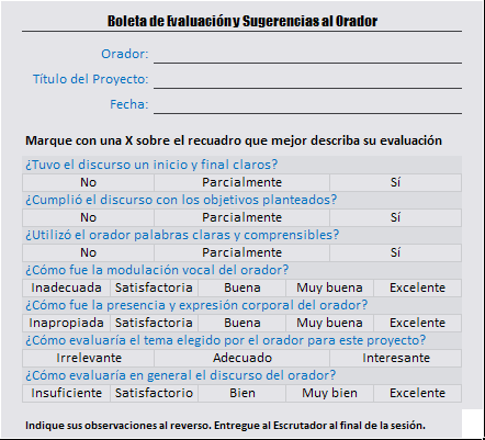 La Boleta de Evaluación y Sugerencias al Orador se enfoca en evaluar aquellos aspectos de orden general de todo proyecto: estructura, empleo adecuado de recursos, lenguaje corporal, variación vocal, etc. No obstante, puedes (y es recomendable) indicar al reverso cualquier comentario adicional que enriquezca el desempeño futuro del orador.